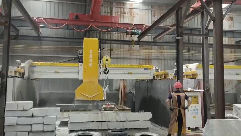本機橫梁采用鋼制構造件, 強度高不易斷裂。整機重量重,切割平穩、下刀量大、產量高。 橫梁切割行走導軌采用高精度線性軌道,機身升降結構采用大直徑四導柱(直徑120mm)液壓升降。配有液壓推動旋轉工作臺,大梁移動實現橫向分片。具有加工長度大,切割深度大,旋轉靈活,定位準確,剛度大,工作平穩等特點。主機采用進口變頻器可實現切割速度的無級調速。適合大批量加工路沿石及高價值的墓碑石。