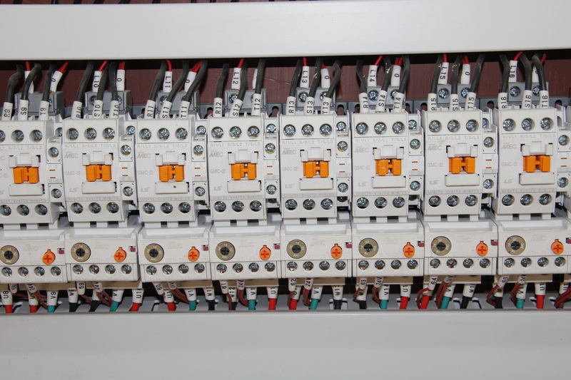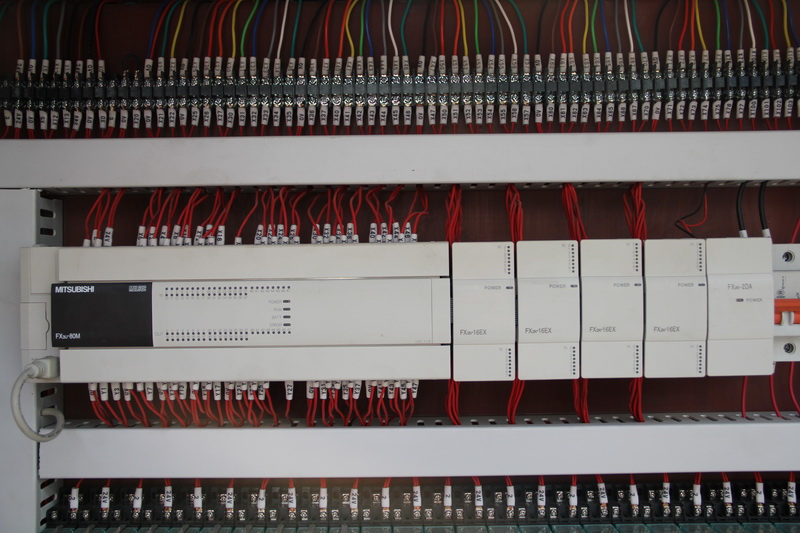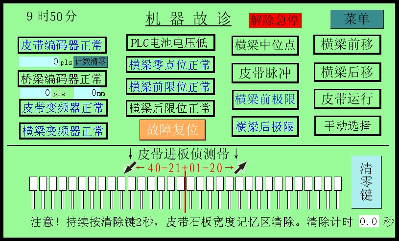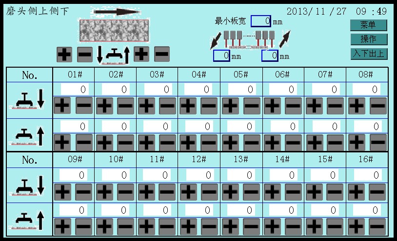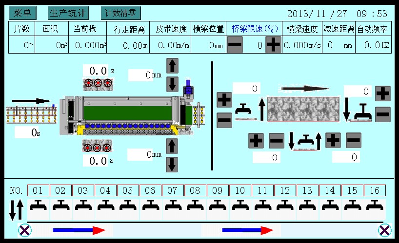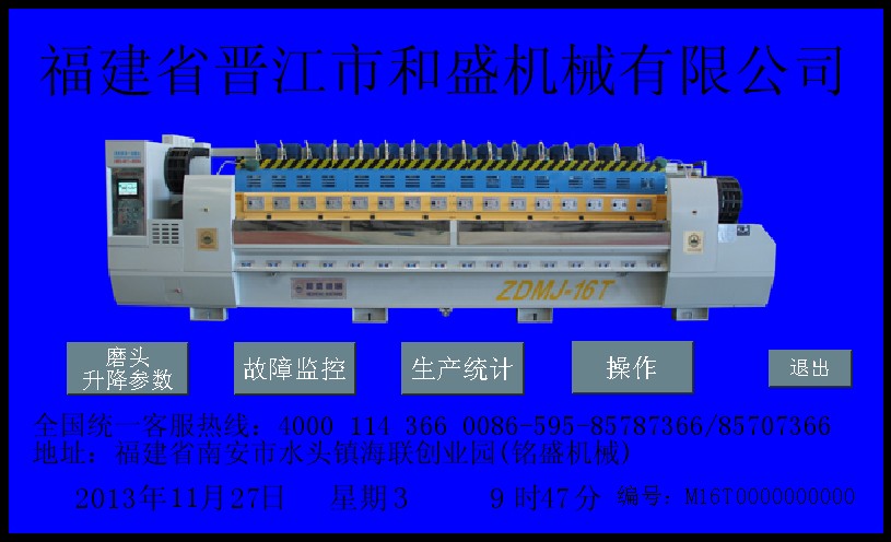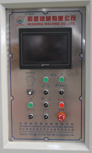 3.該機(jī)控制系統(tǒng)采用PLC終端控制,以液晶顯示觸摸屏終端為人機(jī)界面進(jìn)行參數(shù)設(shè)定,設(shè)備運(yùn)行過程中設(shè)有故障提示等等。該機(jī)適用于花崗石條板的連續(xù)磨削及拋光。板材輸送帶、磨盤橫移梁的工作速度均為變頻器調(diào)速;磨盤工作壓力、板材的磨削寬度在設(shè)定值范圍內(nèi)可調(diào)。本機(jī)可對(duì)板材形狀自動(dòng)識(shí)別,每個(gè)磨盤(磨頭)可根據(jù)識(shí)別板材的形狀自動(dòng)升降,同時(shí)對(duì)板材磨削進(jìn)行跟蹤記錄。整機(jī)均按標(biāo)準(zhǔn)化生產(chǎn),性能穩(wěn)定、故障率低等優(yōu)點(diǎn)。