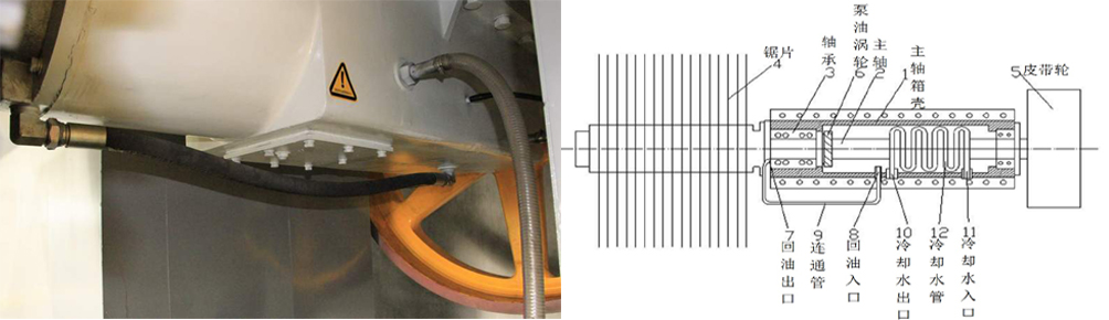3:主軸箱采用專利技術“切石機刀具主軸冷卻結構”,解決了切石機作業(yè)過程中主軸易發(fā)熱問題,可進一步提升潤滑油降溫效果,大大提高主軸箱軸承、主軸等使用壽命,降低維修成本。
