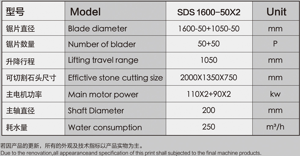 SDS-1600-50X2 隧道式多機組聯合切石機是一種免建廠房可直接安裝于礦山上的石材加工設備。縮短建設周期,提高投資效率;可大大降低石材廠投資成本。該設備為流水線生產方式,鋸片采用同直徑為一組,鋸片直徑從小到大的階梯分布方式。每組鋸片只負責切割一小段,這樣切割可有效減少斧頭板、彎板、斜板等的產生。  整機采用封閉式箱體結構,大大減少了石材加工過程產生的噪音及粉塵污染。并在箱體內部分布多個監控攝像頭,監控切割狀況;并且可實時聯網進行監控操作。